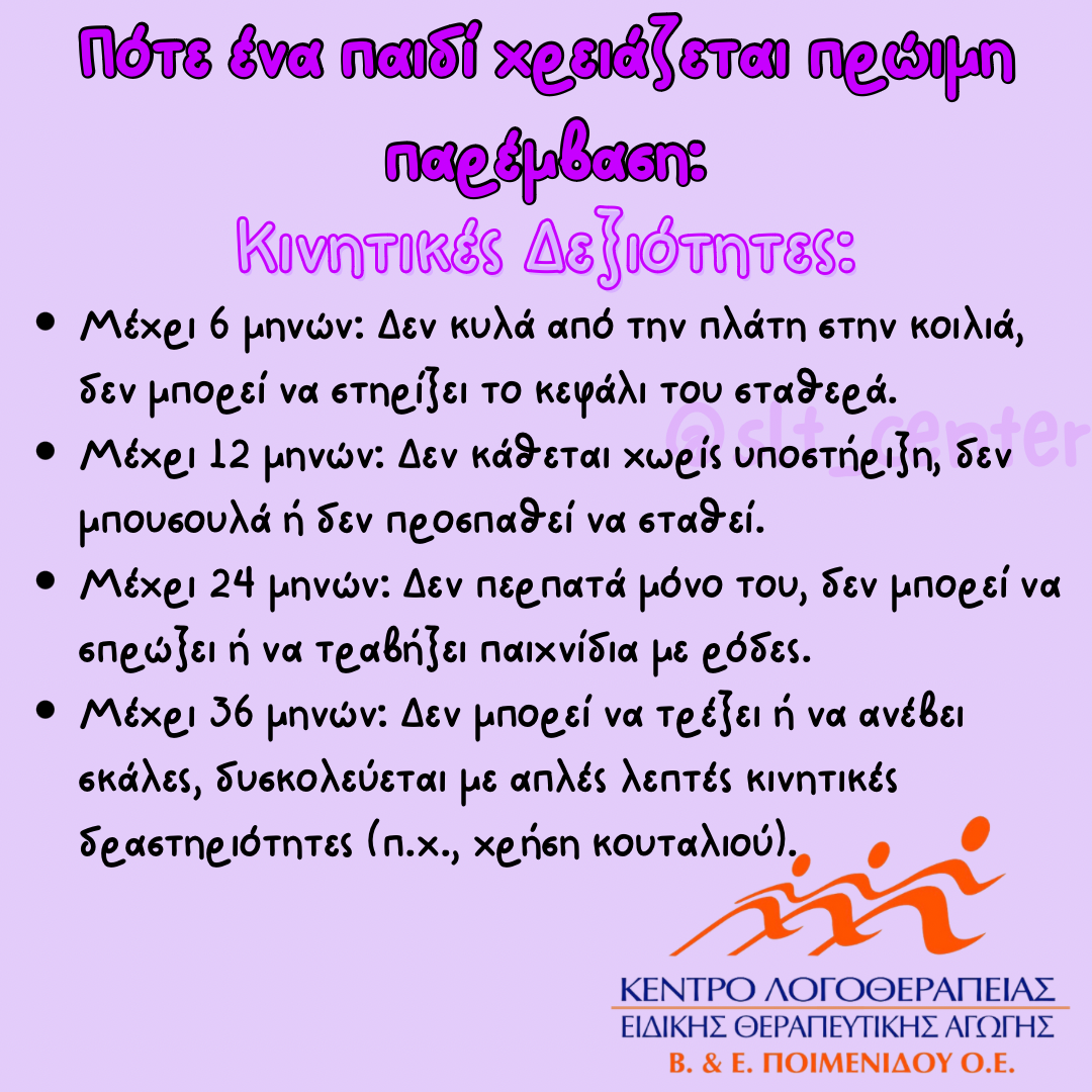 Η πρώιμη παρέμβαση είναι κρίσιμη για την εξασφάλιση μιας ισορροπημένης και υγιούς ανάπτυξης, καθώς και για τη μείωση των πιθανών μελλοντικών δυσκολιών που μπορεί να αντιμετωπίσει το παιδί.